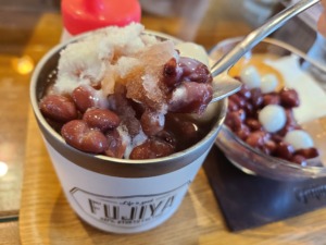 富士家さんのぜんざいは、氷全部にぜんざいの液がしみ込んでいるので氷だけ食べても甘くて美味しいんです。